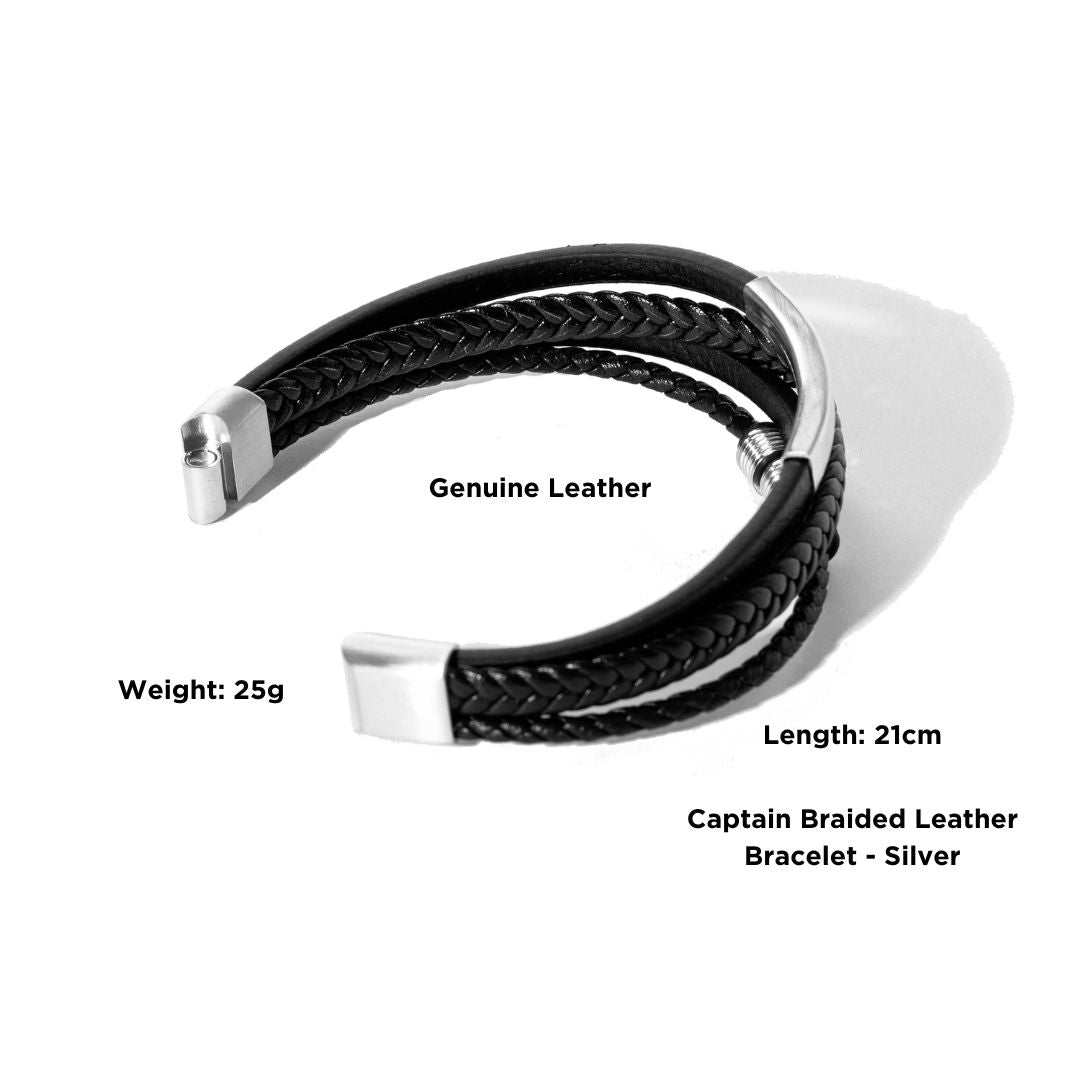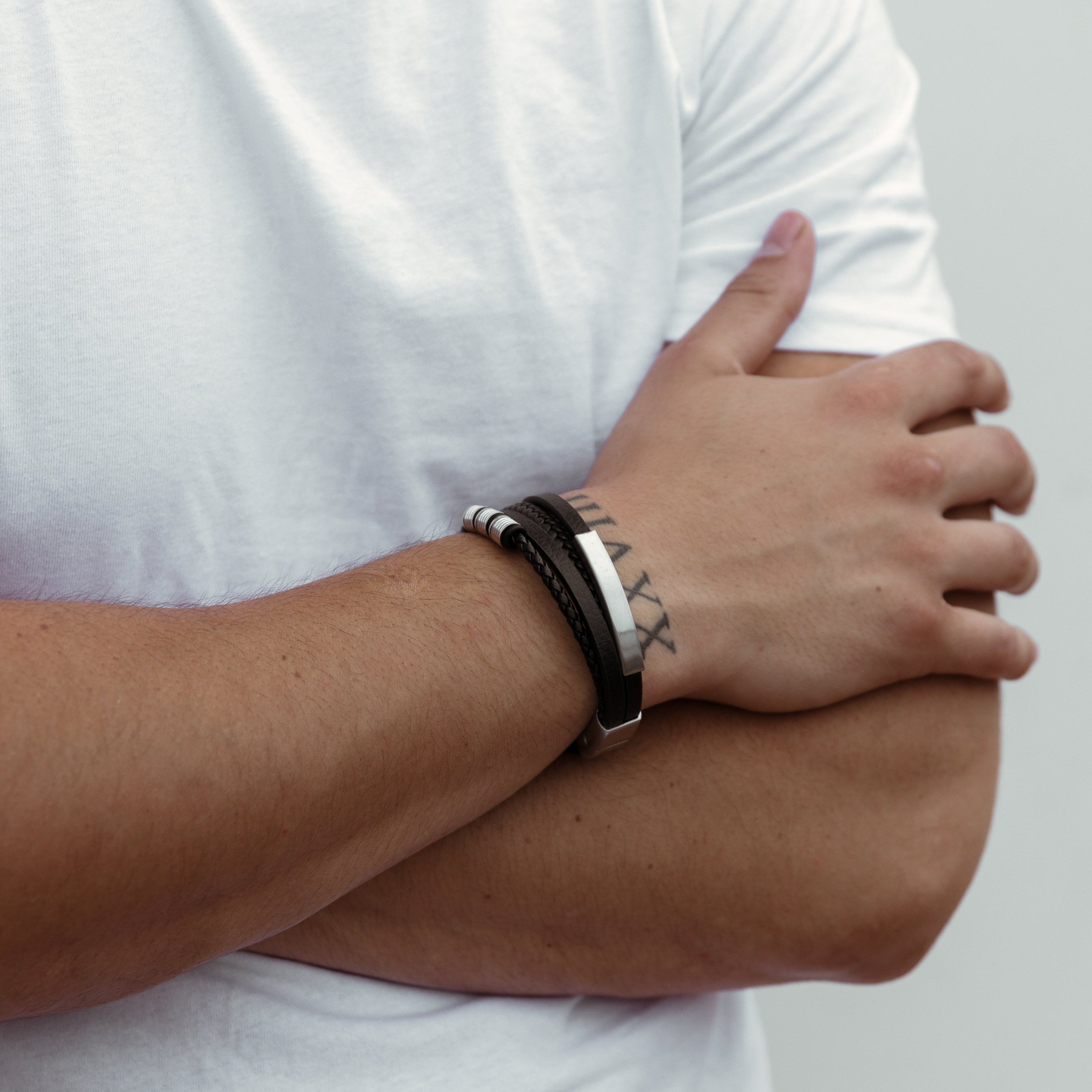 4 leather bands make up this amazing style. 2 x braided bands. (1 x 8mm wide braided in a chevron plait + 1 x 3mm wide braided in a cylindrical plait) 2 x plain bands (both 5mm in width).